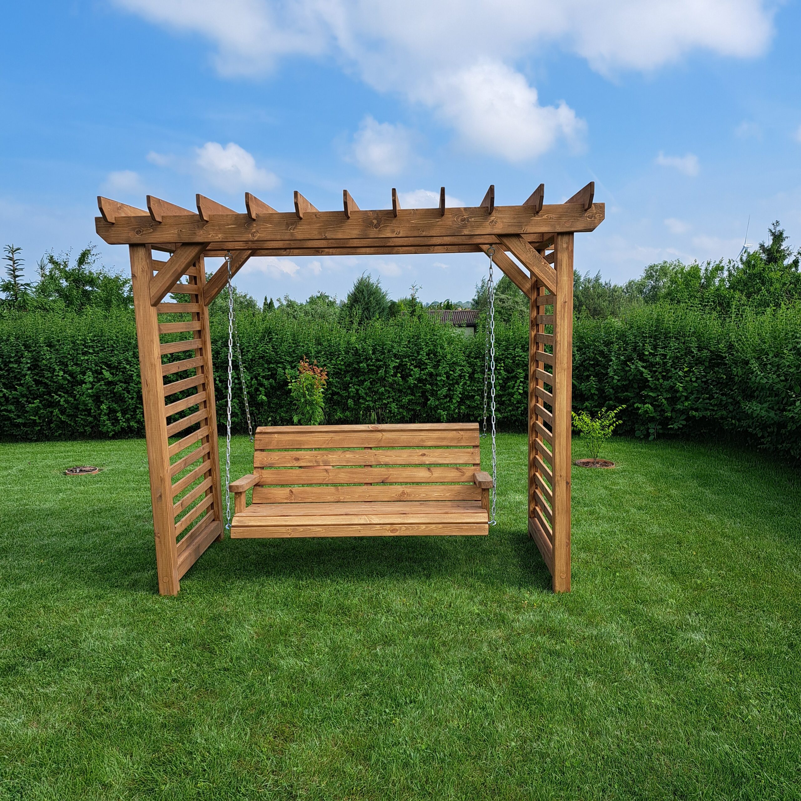Drewniane huśtawki ogrodowe to połączenie wygody, estetyki i solidnego wykonania. Idealne do relaksu w ogrodzie, zapewniają komfort dla całej rodziny. Naturalne drewno doskonale komponuje się z otoczeniem, tworząc przytulną strefę wypoczynku.